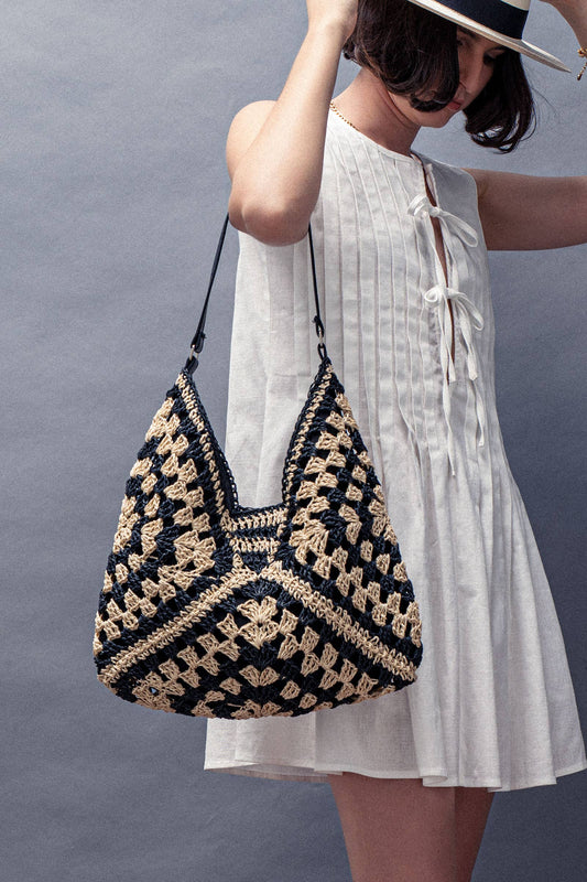 Diamond Pattern Crochet Hobo Bag with Leather Strap: BLACK