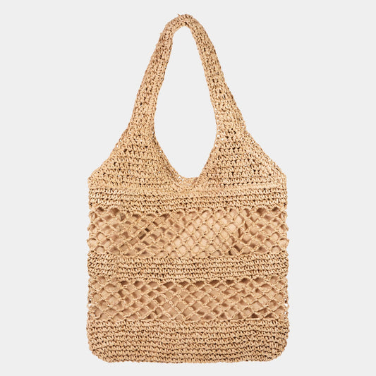 Intricate Straw Knitted Handle Tote Bag: Ivory