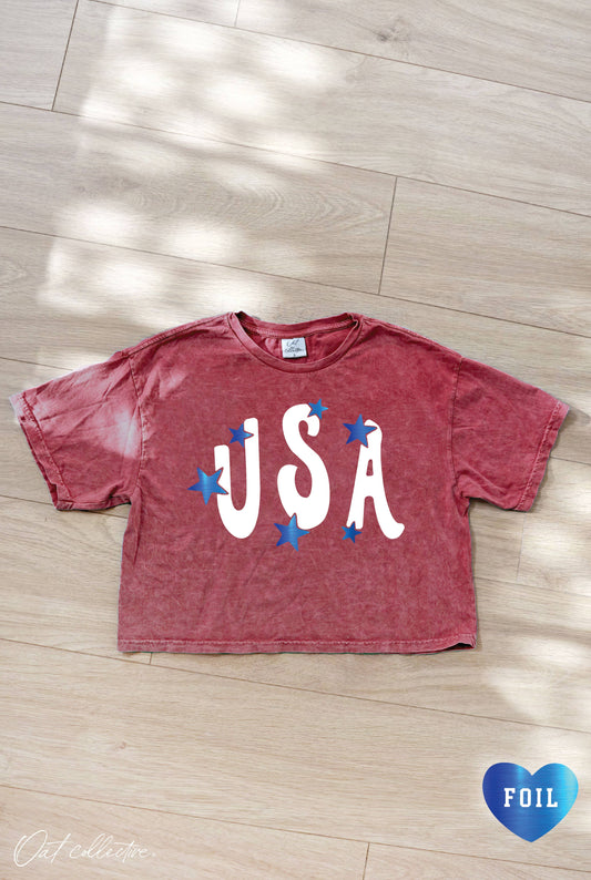USA FOIL Cropped Mineral Graphic Top: CARDINAL