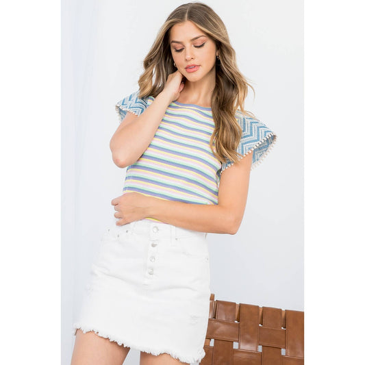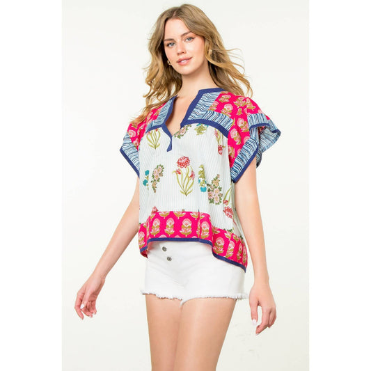 Logan Striped Floral Flutter Sleeve Top: MAGENTA