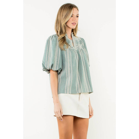 Lynn Embroidered V-Neck Puff Gingham Top: GREEN