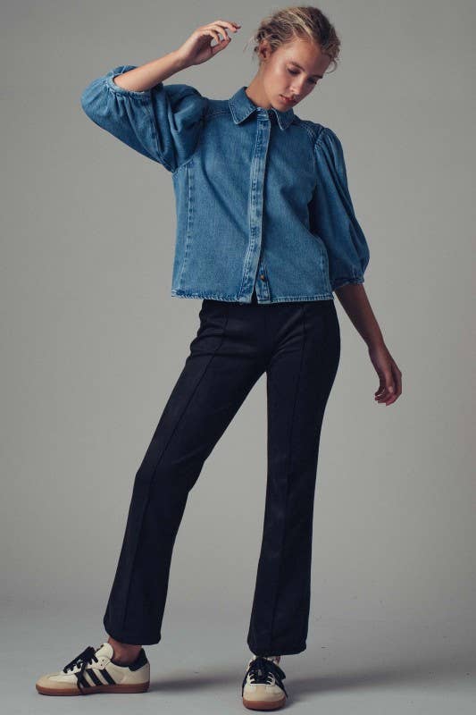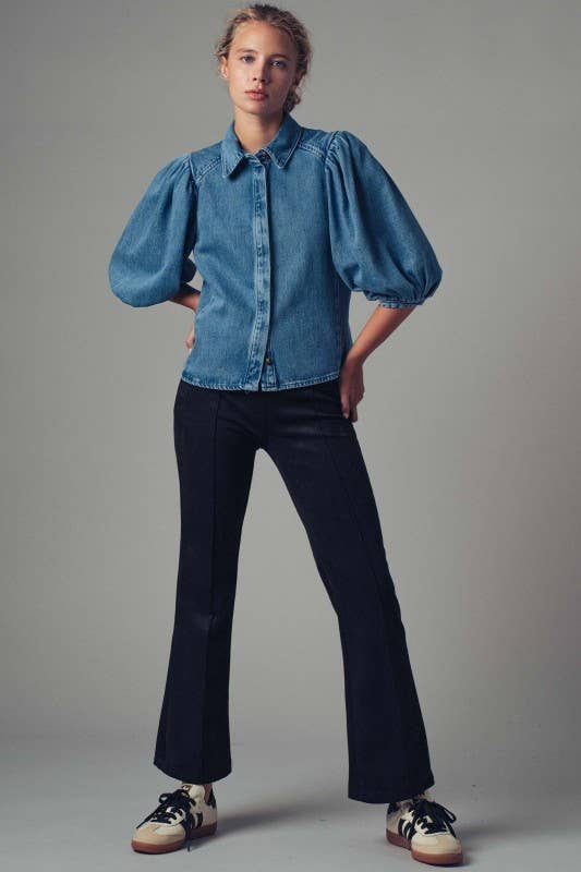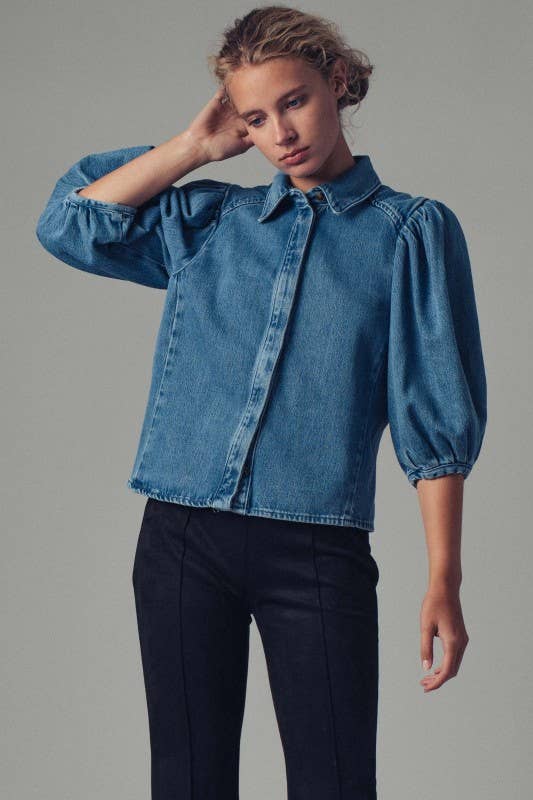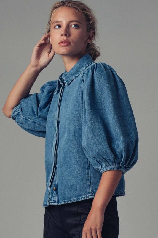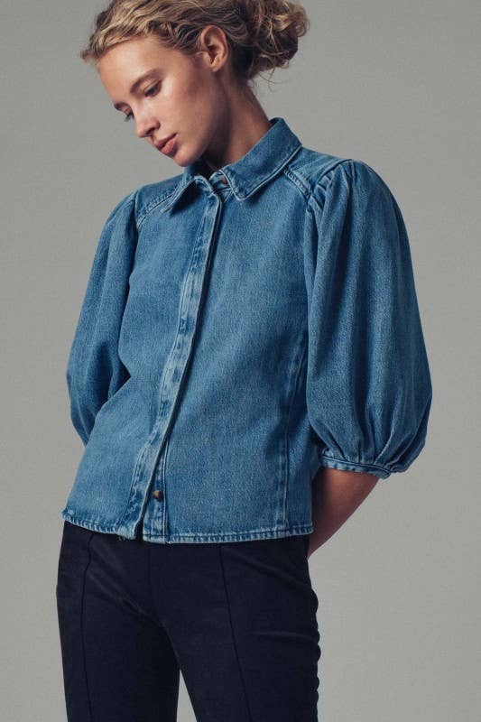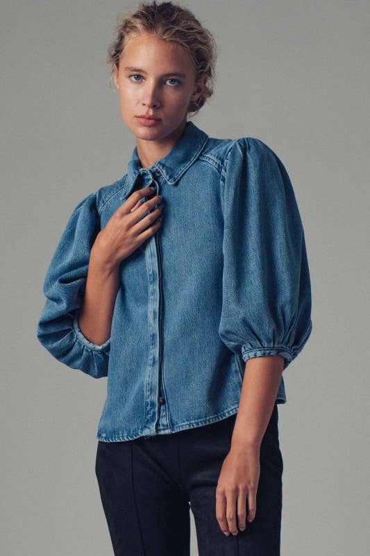 This stylish denim blouse blends timeless structure with feminine flair, featuring voluminous puff sleeves and a relaxed silhouette for modern everyday wear. Features • S-L:2-2-2 • Soft, midweight denim fabric • Puff sleeves with gathered details • Classic shirt collar with button-front closure • Made in China Fit Relaxed fit with voluminous sleeves and gently elasticated cuffs