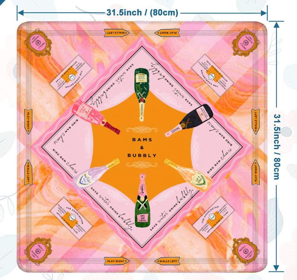The Bams & Bubbly Mahjong Mat is part of our Champagne Mahjong Collection, designed for modern Mahjong players who love stylish entertaining and elevated game nights. Featuring playful champagne-inspired details and soft, chic tones, the Bams & Bubbly design brings a fun yet sophisticated look to the Mahjong table. It pairs beautifully with colorful Mahjong tiles and coordinating accessories, making it a standout piece for Mahjong hostesses and social players. The cushioned surface allows tiles to glide smoothly while helping protect tables and reduce noise during play. With Mahjong rapidly growing in popularity across the U.S., stylish Mahjong accessories are becoming a sought-after category for boutiques, gift shops, and Mahjong specialty retailers. Product Details: Material: Polyester Size 33" x 33" Thickness: 3mm Design: Single-sided print Product Performance: Made from durable, non-slip material to help keep tiles in place during play. The smooth, soft surface allows tiles to glide