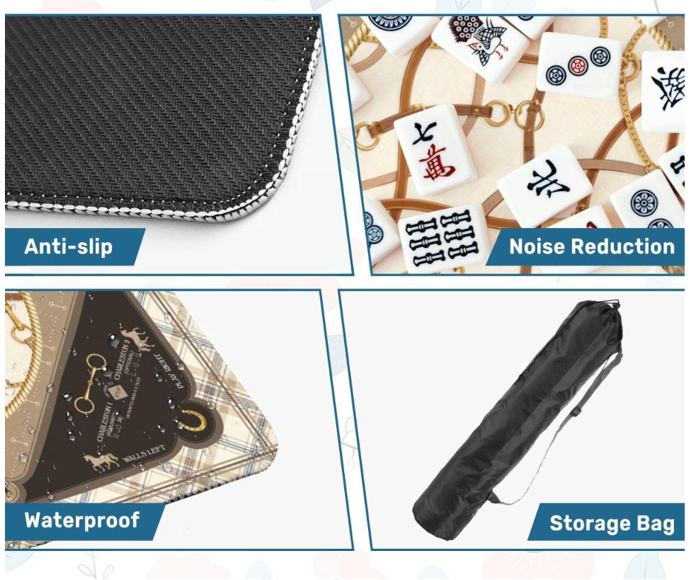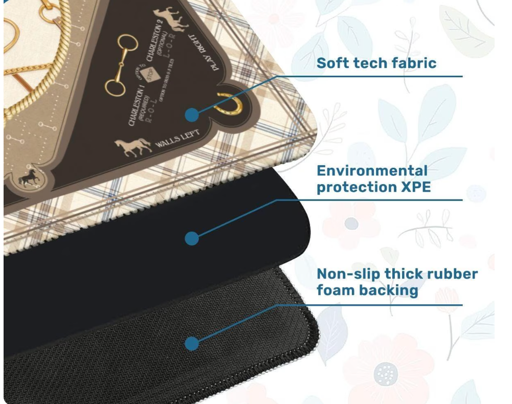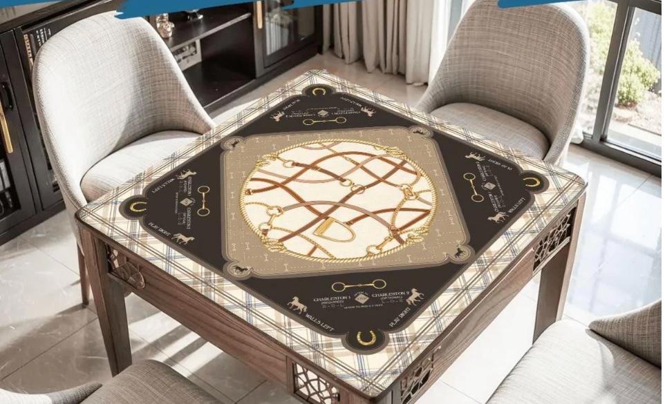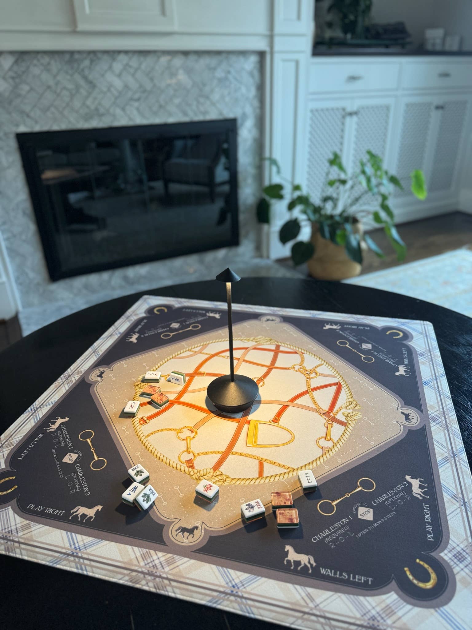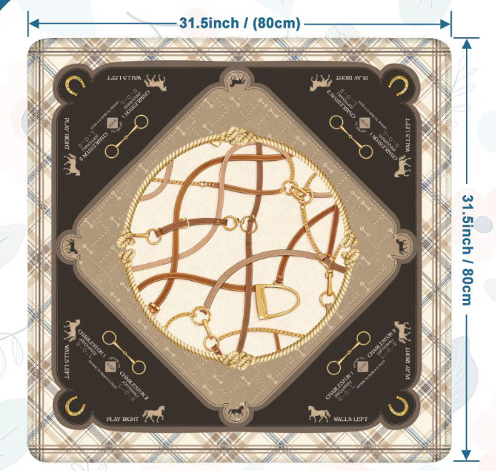 The Derby Day Mahjong Mat is part of our Equestrian Mahjong Collection, bringing classic equestrian style and timeless elegance to the Mahjong table. Inspired by luxury equestrian silk scarves, this design features horse bits, rope borders, and refined saddle motifs in a sophisticated palette of brown, tan, cream, and gold accents. The neutral colorway creates a polished, Derby-inspired aesthetic that elevates any Mahjong setup. Designed for both style and function, the cushioned playing surface allows Mahjong tiles to glide smoothly while helping reduce noise and protect tables during play. Perfect for Mahjong nights, derby parties, country club gatherings, and stylish game tables, this mat offers boutiques and Mahjong retailers a refined accessory that blends classic equestrian design with the growing popularity of Mahjong. Product Details: Material: Polyester Size: 31.5" x 31.5" OR 33" x 33" Thickness: 3mm Design: Single-sided print Product Performance: Made from durable, non-slip material