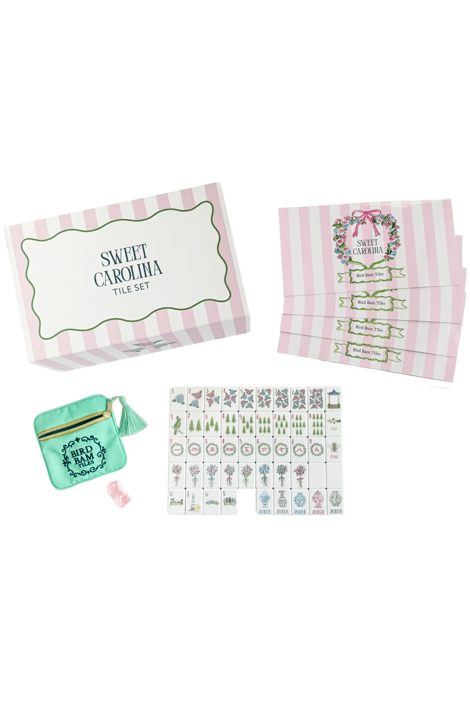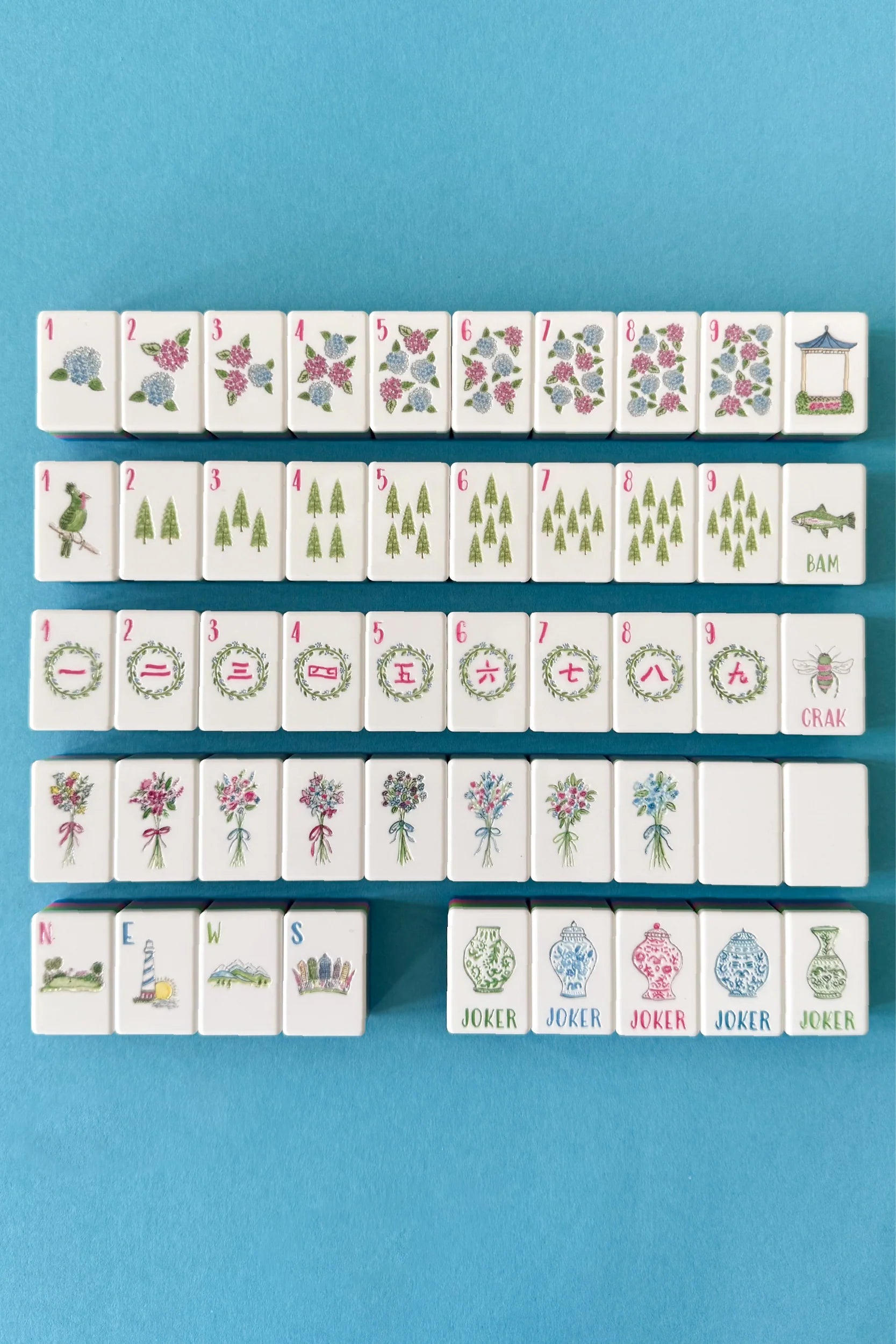 The Sweet Carolina Mahjong Collection features original hand-painted watercolor artwork etched onto premium acrylic tiles. Inspired by hydrangeas in bloom, towering Carolina pines, coastal blues, and mountain greens, this set captures the color, warmth, and unmistakable charm of the Carolinas in every detail.