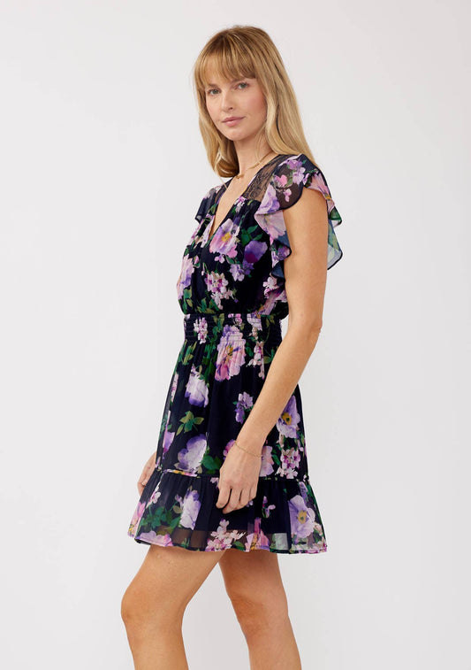 Floral Lace Flutter Sleeve Mini Dress: Navy/Lilac