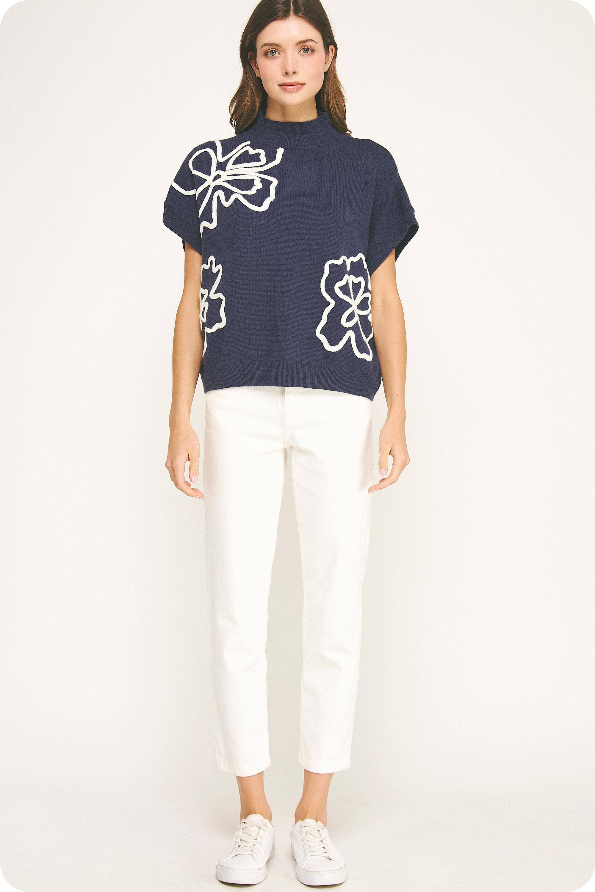 Floral embroidered sweater top in knit fabric. This relaxed knitted top features flower embroidery throughout, a ribbed mock neck, dropped shoulder sleeve with ribbed cuff, and a ribbed hem.