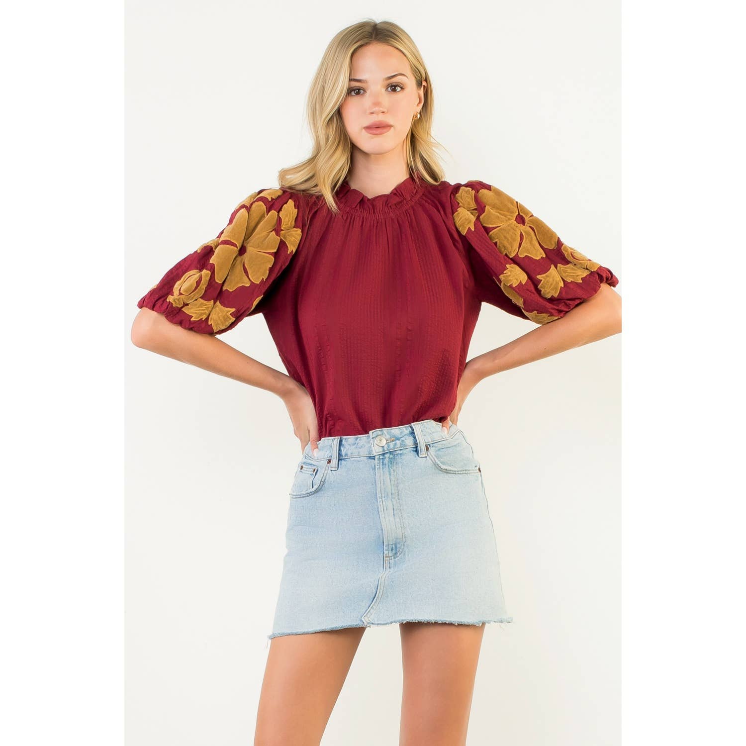 Embroidered Puff Sleeve Top . / Style Measurements for Size S / Body Length: 23 in - Bust Width: 42 in - Sleeve Length: 13 in . / Model Sizes - Wearing Size S - Height 5' 9", Bust 32", Waist 25 1/2", Hips 36" .Fabric Content - WOVEN / 100% Cotton