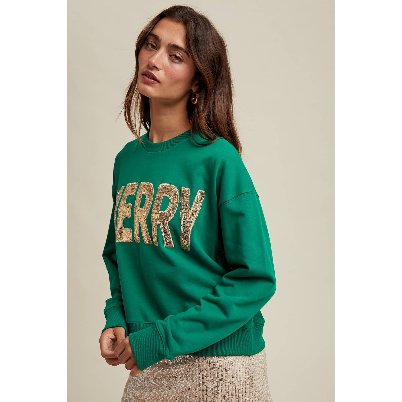 - Shine bright in the 'MERRY' Sequin Sweatshirt. With festive sequins and cozy comfort, it's perfect for adding sparkle to your holiday season.