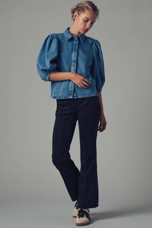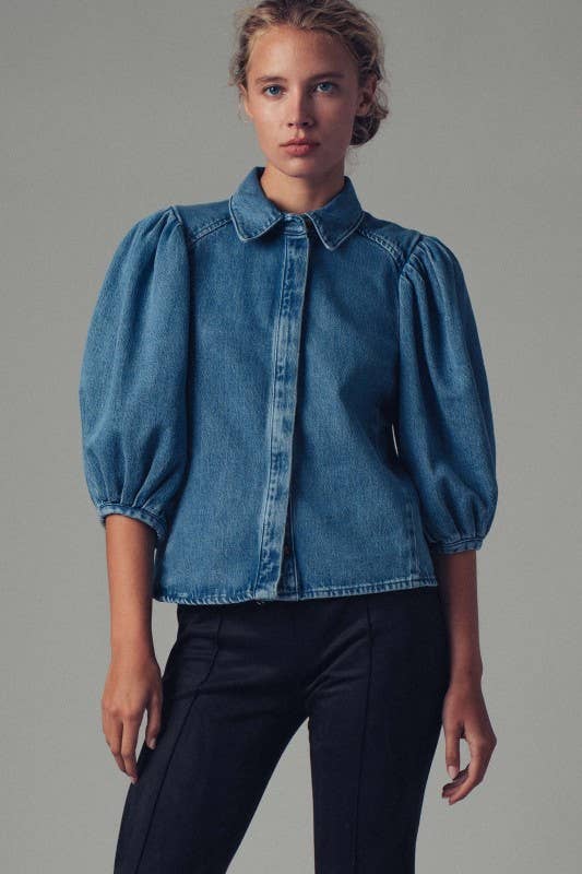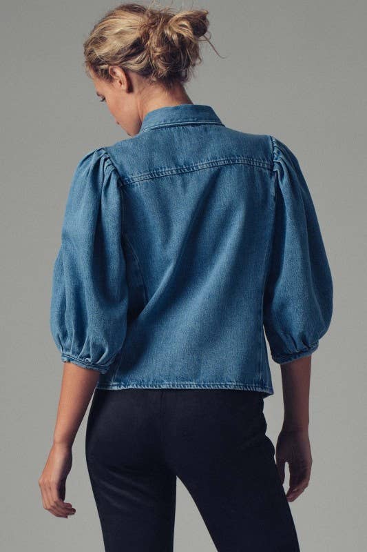 This stylish denim blouse blends timeless structure with feminine flair, featuring voluminous puff sleeves and a relaxed silhouette for modern everyday wear.