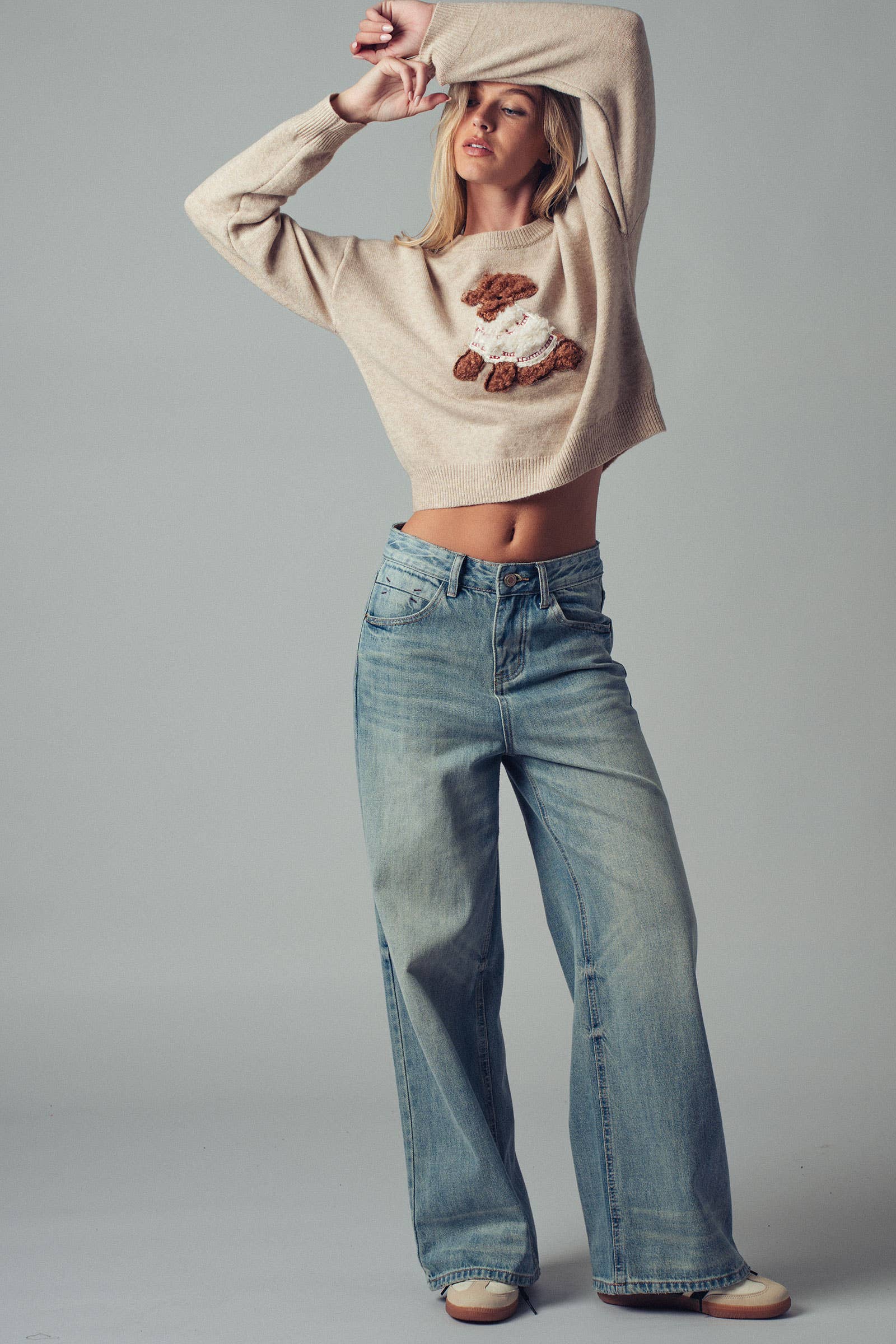 Add playful charm to your look with this cozy knit sweater featuring a textured 3D puppy embroidery. Perfect for layering over denim or pairing with skirts for a relaxed, fun statement.