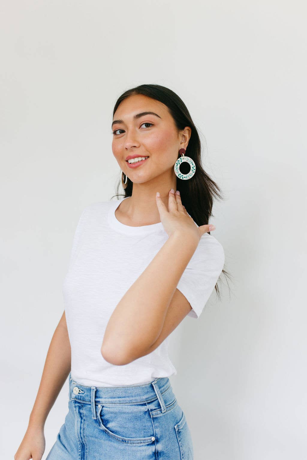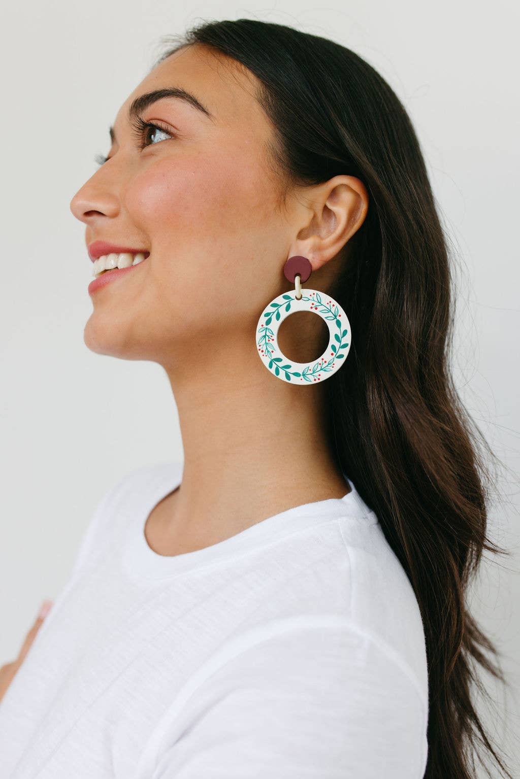 2 3/4" x 2" Hand painted buffalo horn statement earring. Very lightweight. Stainless steel post and horn jump rings. Care instructions: All items in our jewelry collection are hand-painted and made from buffalo horn.